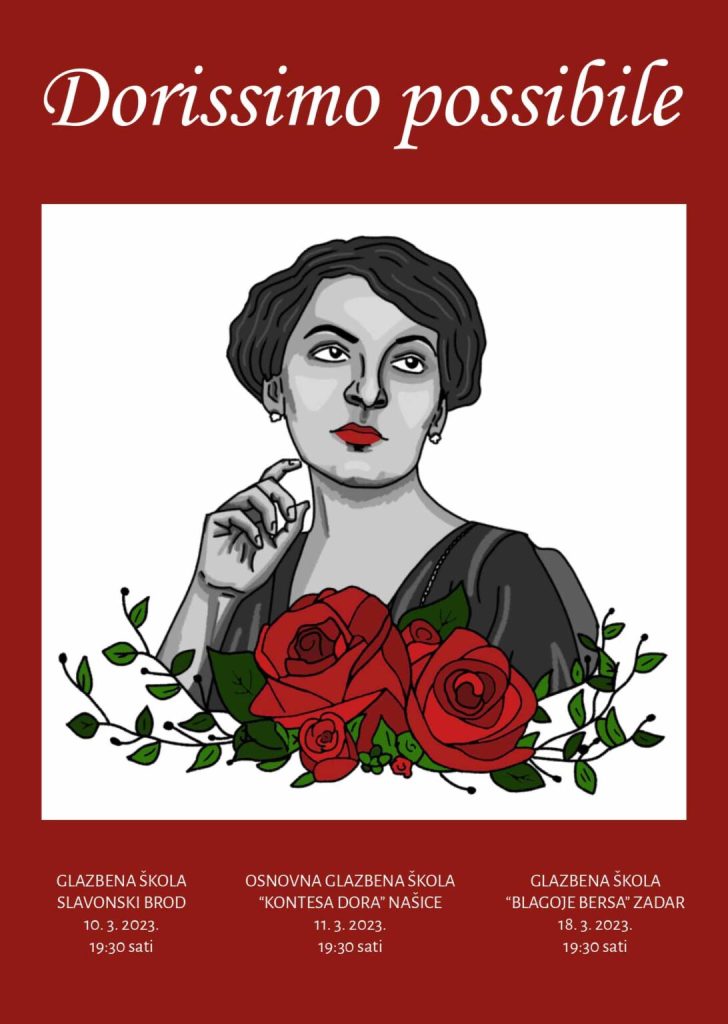 Ove 2023. godine obilježavamo 100 godina od smrti Dore Pejačević, skladateljice čiji se opus smatra jednim od najznačajnijih glazbenih opusa u povijesti hrvatske glazbe i čija je europska prepoznatljivost danas neupitna. Koncertnim projektom DORISSIMO POSSIBILE, koji će prirediti učenici osnovnoškolci i srednjoškolci te njihovi mentori iz spomenutih triju glazbenih škola, programski ćemo se usredotočiti na život i glazbeni opus jedne od najznačajnijih hrvatskih skladateljica.